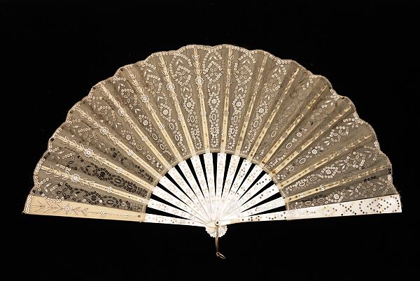 This is an exemoplarp of the type of fan decoration in which the variously shaped and formed sequins are combined to make up the design. Here there are flower heads, elliptical shapes, stars and ovals combined with regular round sequins that are combined, to give the appearance of foliate forms enclosed in geometric frames. The designer of this fan also makes good use of piqué work, or inlaid silver dots, in the sticks and guards. Piqué work was intended to imitate sequins and was a popular technique for adding additional sparkle in fan leaves and guards