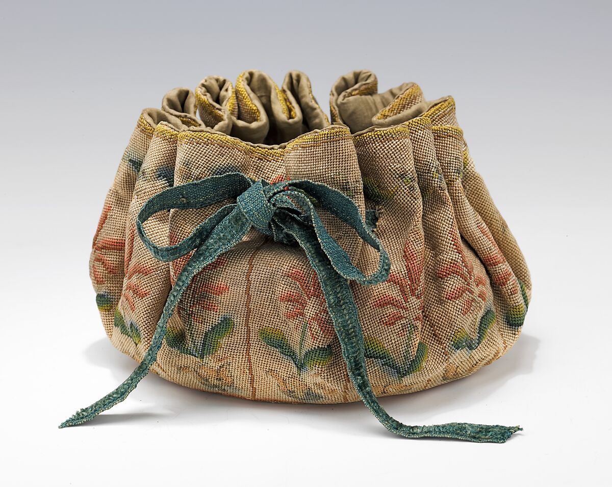 A new level of card game mania swept Europe during the 17th century and continued into the 18th century. Gambling with cards or "gaming" was a favored pastime for both men and women of all ages and classes. Gaming purses, round flat-bottomed pouches that closed by means of a drawsting were worked in various materials. This examples is worked in fine petit point needlework. Its repeat pattern of pink flowers is interrupted only once by a single yellow flower. This anamoly may have personalized the bag, relating it to a particular owner.