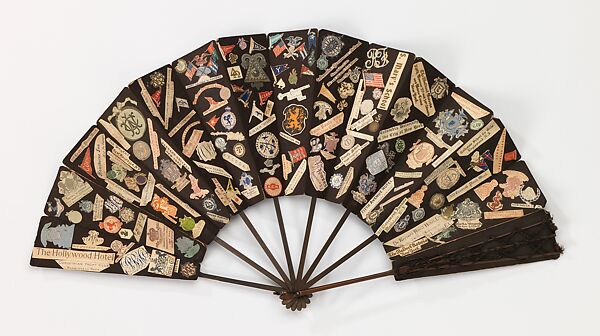 Created according to instructions from ladies' magazines of the time, memorabilia fans such as this are Interesting documents from their periods. They represent commercial design styles as well as what people considered worthy of recording both from the personal and social point of view. Here prestigious institutions as well as places holding personal memories are noted in the approximately 500 cutouts applied to the fan. The Waldorf Astoria Hotel in New York, The Hotel Algazar in St. Augustine, Florida, Yale University, Barnard College, The Old Apple Tree in Nutley, New Jersey and the Laurel Pines Hotel in Lakewood, New Jersey, which opened in 1891, are some of the institutions and businesses represented. The maker of this fan was a native of Nutley, New Jersey.