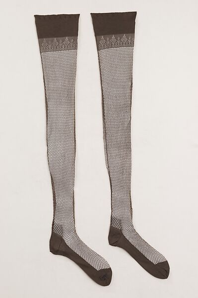 The beautiful patterning in the upper band of this pair of stockings makes them an excellent example of the fine styling in hosiery. The design at the thigh band exemplifies the seductive sensibility of hosiery, even though it is no longer at the ankle as in other styles of fin-de-siècle.