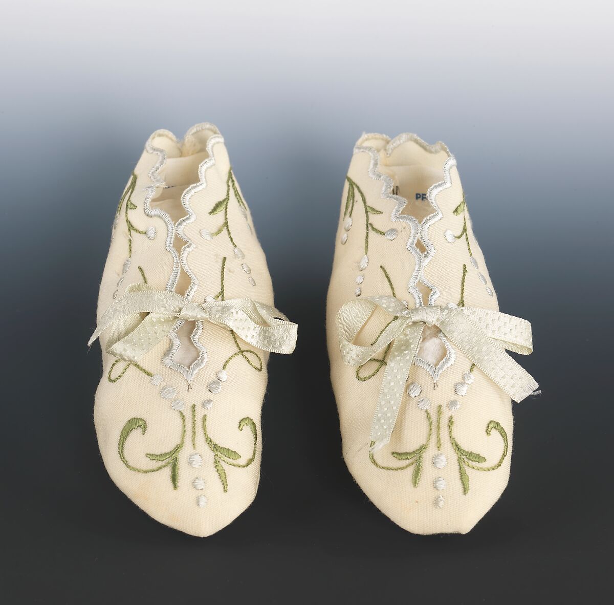 While clothing for babies commonly falls outside the aegis of fashion, it is common to see the reflection of current modes in the better examples. This pair of high style booties illustrates the contemporary taste for pastel coloration and restrained embroidery. The placement of the embroidery around the opening and the choice of a stylized symmetrical curling vine motif is one which can be seen repeated in numerous garments of the period. The low cut, not the most practical for a baby shoe, is a fashionable feature as well.