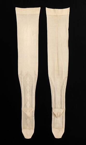 Stockings, originally designed for practical purposes, soon transformed into a fashionable accessory with the invention of the knitting frame in 1589 and then the circular-knitting machine in 1816. This technology allowed for a tighter weave and a better fit. Also, it was much easier to produce stockings, making them more affordable and readily available to a larger public. Plain white stockings were in mode for quite some time, until the mid to late-1800s when hemlines rose, and the ankle was revealed. This change in fashion called for colorful and fanciful motifs to decorate the lower leg, a visually appealing effect.