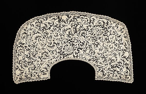 The lace was originally a larger piece, possibly a flounce, and was cut and fashioned into a collar, probably in the late 19th or early 20th century. The neck edging also dates from the later period. Reconfiguring fine old laces into updated styles was a common practice.