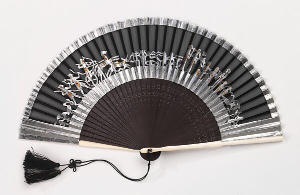 This is a fascinating example of one of the many items made during the Egypto-mania period of the 1920s after King Tutankhamen’s tomb was discovered in 1922. The pierced sandalwood sticks and very finely crafted cut-out silver paper creating the frieze-like Art Deco decoration that moves across the fan leaf mark it as a Japanese-made object. While it may have been made for the Western market, it could also have been made for the domestic market, as interest in Western art and culture was beginning to take hold in Japan at that time.