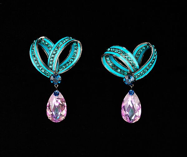 The 1980s represented a moment in time for exuberance in costume jewelry, seen particularly in large-scale pieces that incorporate large stones or swinging elements. Yves Saint Laurent, the designer of this pair, and other designers embraced faux stones with a fervor not seen since the 1940s, when large sets of matching faux jewelry served as a means of enlivening wartime suits. The striking color combination of this pair draws attention to the wearer's face and exemplifies the brilliant colors in vogue during the 1980s.