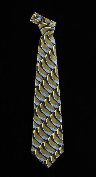 The Optical Art aesthetic of the 1960s readily translates into this intriguing tie. The flat pattern appears to dance in a three dimensional manner and would allow for creative expression for men who traditionally were required to dress in standardized suits.