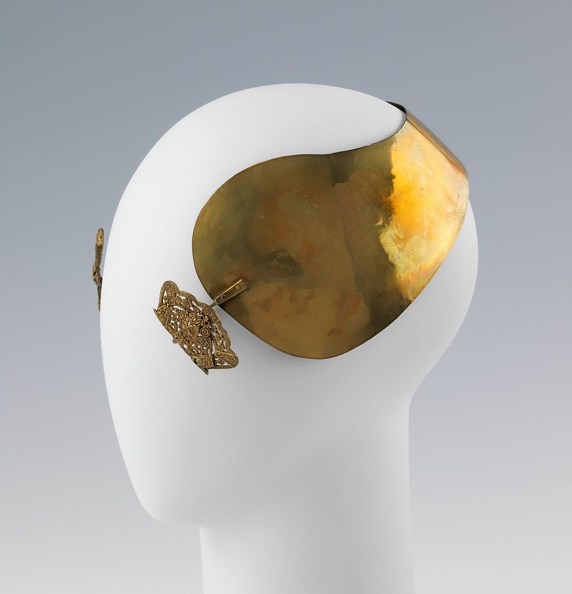 One of the most recognizable and interesting aspects of Dutch costume is the ear-iron. The Frisian style of this headwear is a wide band of metal fitting around the back of the head with ornaments at the temples. The shape and style of the ornaments were indicative of their status, their husband's or son's profession, their locality, or even their religion. This example, also pictured with the traditional lace cap (2009.300.1690a, b) is made of brass, as opposed to the more expensive silver or gold.