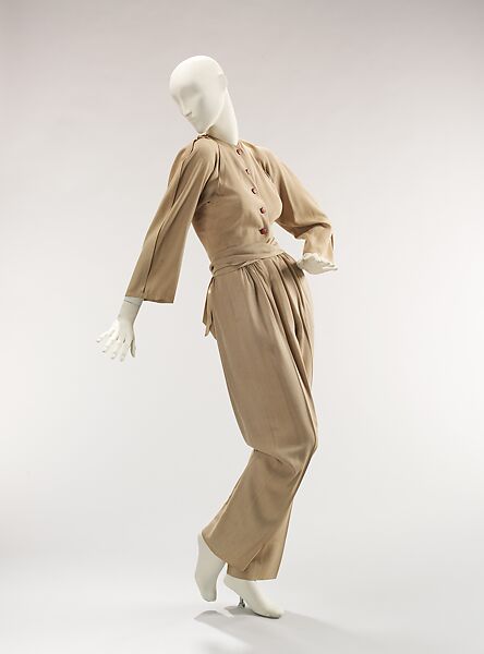 This ensemble is an excellent example of American sportswear popularized during the forties. McCardell as well Vera Maxwell were both designing day ensembles such as this. The wool pantsuit is not only flattering to the figure, with the belted waist, but is made of wool jersey which is comfortable and nonrestricting. The choice of fabric, the subtle color and the simple design are characteristic of McCardell's work.