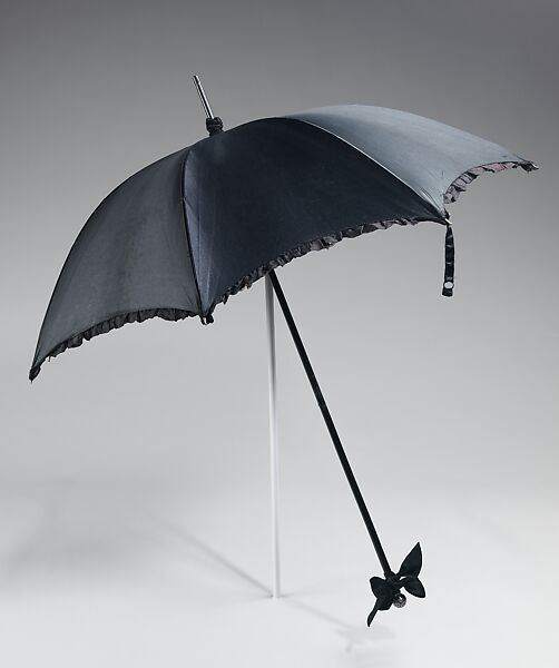 Extremely coquettish and seductive, this parasol is much like revealing lingerie. The severe exterior opens to reveal an extremely frilly and feminine interior. During this period, underwear also became very decorative and seductive and this piece is an equivalent in the category of parasols.