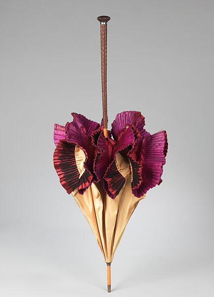 The parasol featured here captures the essence of the 1890s with its gay color combination and exuberant lace-covered ruffle at the hem. The detailing of the handle is very engaging. Also, the color combination of the garnet ruffle and the purple lining is indicative of the period and a typical French touch.