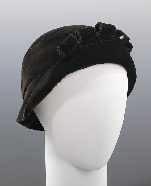 This modified cloche shape is indicative of the evolution the style took from the mid-1920s into the 1930s. The simple loop trimming is a classic decorative device of Lanvin's which she utilized continually. Her ability to create different textures simply by manipulating the textile became a key feature of her designs throughout her career.