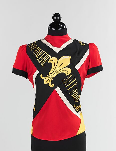 Schiaparelli often collaborated with textile manufacturers to create fabrics exclusively for her collections. This blouse from her summer 1940 collection, worn by fashion icon Millicent Rogers, is an example of that relationship with Colcombet. The print is based on French regimental flags and was used on evening dresses as well. The woman who wore this blouse could still look feminine while supporting her country during war time. Another element often seen in Schiaparelli's work, trompe l'oeil, is evidenced here in the scarf effect around the neck achieved both by cut and by the thoughtful placement of pattern.