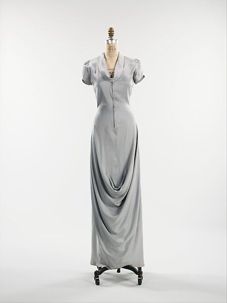 In luxurious satin of a delicate, subtle cross between pale blue and gray, this evening dress from the fall 1939 collection exudes an understated chic and sophistication. The characteristic Schiaparelli plastic zipper cuts down the bodice and is prominently displayed down the torso. While many designers tried to conceal closures, Schiaparelli incorporated them as part of the design as both functional and decorative elements. The construction is intriguing, with the drapery and closure on the front, like the dress is being worn backwards, surely a Surrealist-inspired idea. Short sleeves on an evening dress are also an unusual, witty choice. Worn by the ever stylish Millicent Rogers, this evening dress would have created a stir, always the point when wearing Schiaparelli.