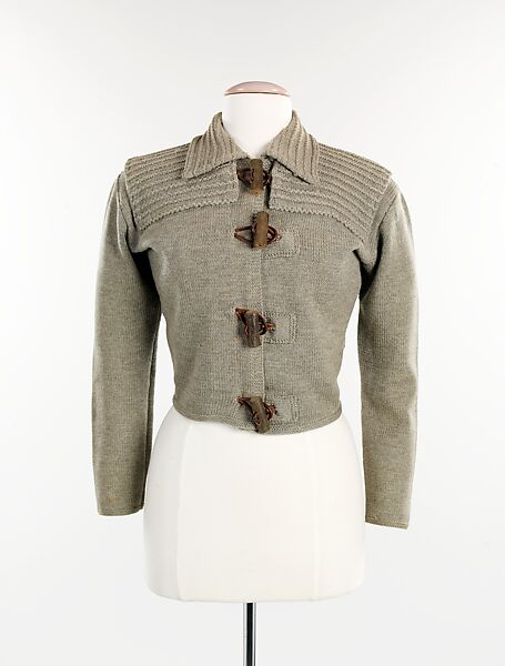 This rustic sweater, worn by Millicent Rogers, is an example of Schiaparelli's penchant for using off-beat closures, construction details and intriguing fabrications to impart an artistic flair to her often simple silhouettes. Schiaparelli frequently used clever shapes and innovative materials for her closures and the rolled leather log buttons seen on this sweater are a clever example of that idiosyncrasy. The unique construction, particularly the application of the shoulder yoke after the sweater was knit as a whole, and the use of contrasting knit patterns on the yoke, collar, button tabs, hem, button placket and sleeve ends, add visual interest and texture.