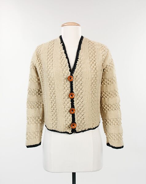 Schiaparelli continued to offer her clients hand-knit sweaters throughout her career. As seen in this sweater owned by Millicent Rogers, and as she did with several types of clothing, Schiaparelli embellished a simply cut garment with unique fabrics and closures. This sweater is knit of a textured popcorn pattern, incorporating stripes of purl stitch, the looped underside of the knit, as a prominent aspect of the design. The contrasting textures make for a visually pleasing effect. Schiaparelli enjoyed using many forms of closures that expressed her artistic personality, such as plastic zippers, oversized buttons and buttons in various fanciful forms. The large wooden buttons on this sweater are an example of a closure that is unusual because of its size and concave shape, not necessarily because it’s an odd form.