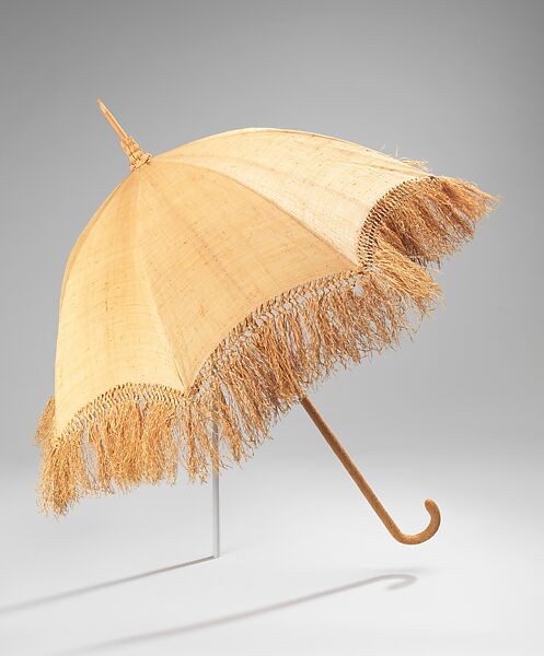 This is an example of a whimsical yet practical and stylish parasol. Made completely of straw, this material was more typically used in hats to shade the wearer from the sun. A parasol made of straw in such good condition is fairly rare.