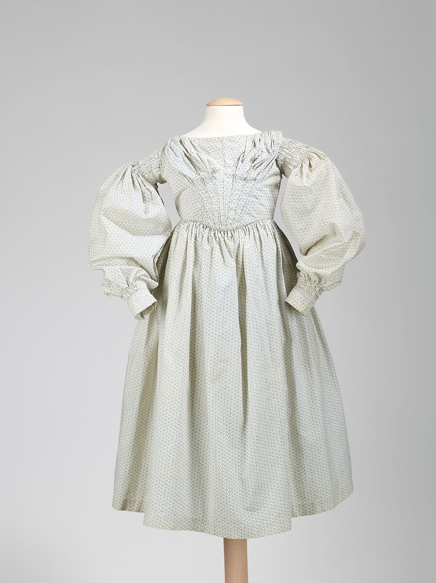 It is charming to see period dresses produced in miniature sizes for children, and the dress shown is a very high-style garment. It is a perfect example showing the collapse of the gigot sleeve in 1837 and the beginning of the V-shaped form of bodice in the 1840s. Additionally, the puffing over the bust adds another adult dimension.