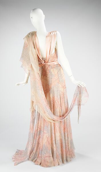 Layers of gossamer, yet strong, silks cut on the bias, with free-floating ties, make this evening dress an exemplar of Vionnet's work. The design also features a pastel foliate print of the type favored by the designer, here with a pattern of fern leaves. The satin ties of the dress were originally held by a jade buckle, which was not received with the gift.