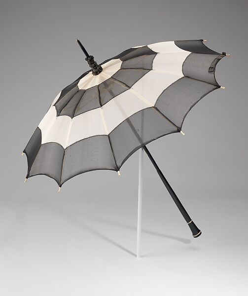 Parasols such as this were an important part of the fashionable ensemble. Undoubtedly, this served as a feminine conceit with very little function since the sheer fabric provided little shade. The handle of this parasol is particularly stunning, and the black and white color motif is carried through on all parts of the piece. The provenance adds extra interest as it was donated by the Mary Flagler Cary Charitable Trust established in 1938.