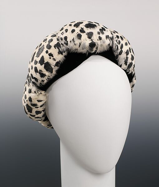 The hand painting and application of feathers is a uniquely couture, with a whimsical reference to Dalmatian spots. The print might have been in response to the publication of Dodie Smith's book "The Hundred and One Dalmatians".