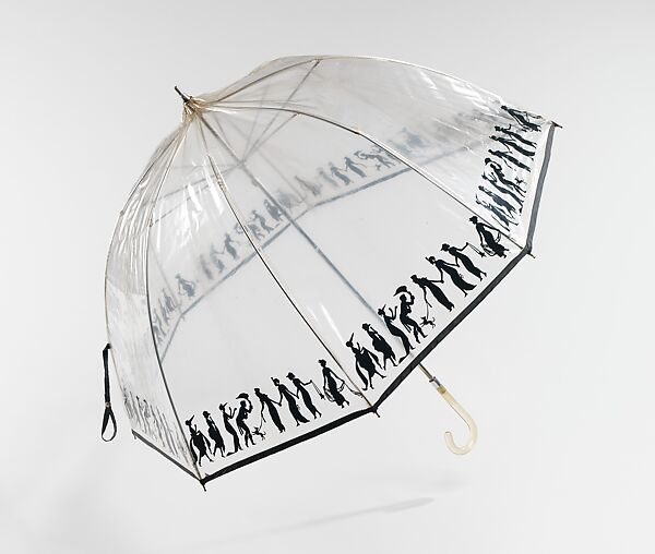 Today's savvy fashion consumer is acquainted with myriad designer logos which boldly announce the wearer's pretense to taste, status, and membership in the "in crowd" of their choosing. The display of designer logos is not a new phenomenon, but the practice of buying and using boldly brand-emblazoned apparel witnessed a notable expansion in the 1970s which has continued to this day. This umbrella figures early into the craze for logo-centric design by featuring the well-known silhouette parade that had been the iconic imagery of Bergdorf Goodman packaging since [date?]. Despite its exclusive pedigree, the umbrella is inexpensively made, and was presumably given away to customers as a marketing tool. Plastic and vinyl had a clean, modernistic connotation, and were used extensively in fashion and rainwear in this period.