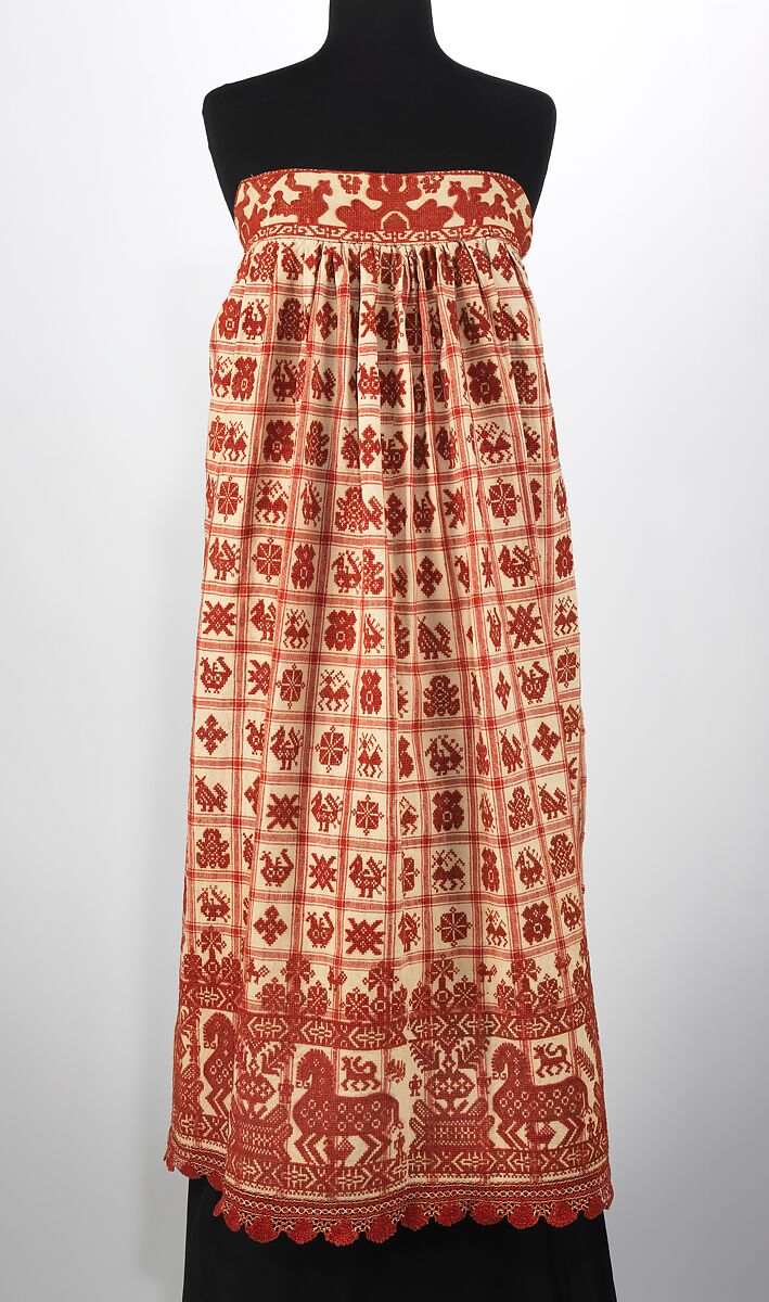 This object is from the collection of Natalia de Shabelsky (1841-1905), a Russian noblewoman compelled to preserve what she perceived as the vanishing folk art traditions of her native country. Traveling extensively throughout Great Russia, she collected many fine examples of textile art of the wealthy peasant class. From the 1870s until moving to France in 1902, Shabelsky amassed a large collection of intricately embroidered hand-woven household textiles and opulent festival garments with rich decoration and elaborate motifs. The Brooklyn Museum holdings include many fine examples including the majority of the garments. Portions of Shabelsky's collection are also housed at the Museum of Fine Arts, Boston, the Cleveland Art Museum, and the Russian Museum of Ethnography in St. Petersburg.