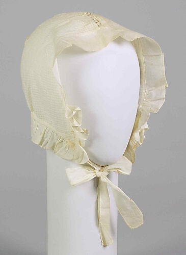 This elegant and detailed morning cap with refined details would have been worn primarily at home in the early part of the day as an informal head covering, prior to donning the more formal structured bonnets required for the afternoon or evening. It follows the same silhouette as the period's fashionable hats and bonnets constructed of more rigid materials such as straw.