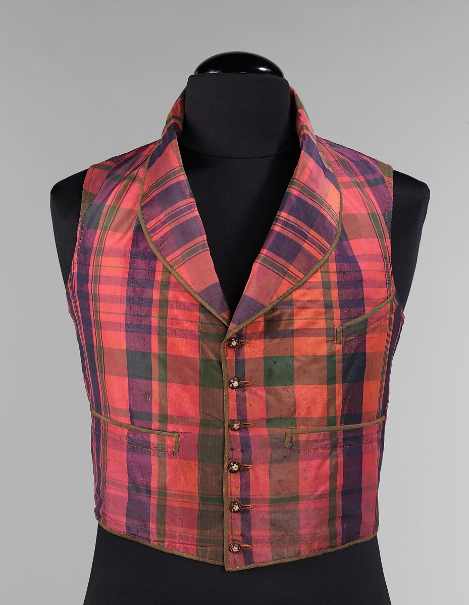 Waistcoats and vests of the 18th and 19th centuries served as a layer protection and ornamentation during a period in fashion when the coat was intended to be left open in the front. The color was often chosen to complement the suit and covered in imaginative embroideries, heavily woven patterns or shiny satins made to draw the eye. The style of the neck, the length and the hem treatment fluctuated as the tastes changed from over-sized coats of the early 18th century to narrow tightly fitted coats of the late 18th century and onward.