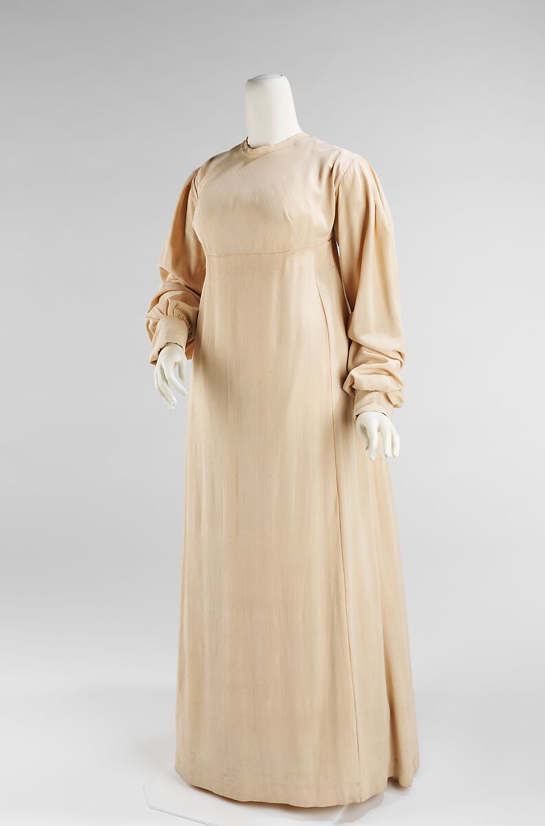 The use of the bias cut in the bodice, band collar and draped sleeves gives this Empire dress an unusual surprisingly modern minimalistic sensibility. There is almost a monastic sense about it from its minimalism.
