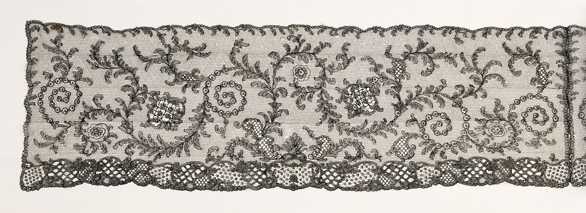 Rita de Acosta Lydig (1880-1929), a noted beauty and style icon of the early 20th century, collected antique textiles and lace, which she often incorporated into her wardrobe. Born in Spain, de Acosta Lydig attributed her love of lace to her aristocratic Spanish heritage. In this black lace shawl, the scrolling tendrils resemble the patterns seen in Fourth Style Roman wall paintings. Shawls of this type began to be made by machine in the mid 19th-century. Since much handwork was still needed to finish the pieces made by machine, it can be difficult to determine which were handmade and which were made by machine. This, however, is a handmade example.