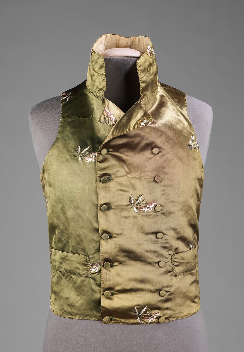 This very elegant vest is indicative of the taste for very high stand collars alongside double-breasted waist-length styles which came into focus near the end of the 18th century. The use of satin is flashy next to the elaborately embroidered waistcoats of the previous century, and shows their fashionable continuation as a decorative element in the male wardrobe. The embroidered flowers are a remnant of the styles of the previous century and indicate the transition into the heavily patterned woven textiles used for vests in the 1820s.