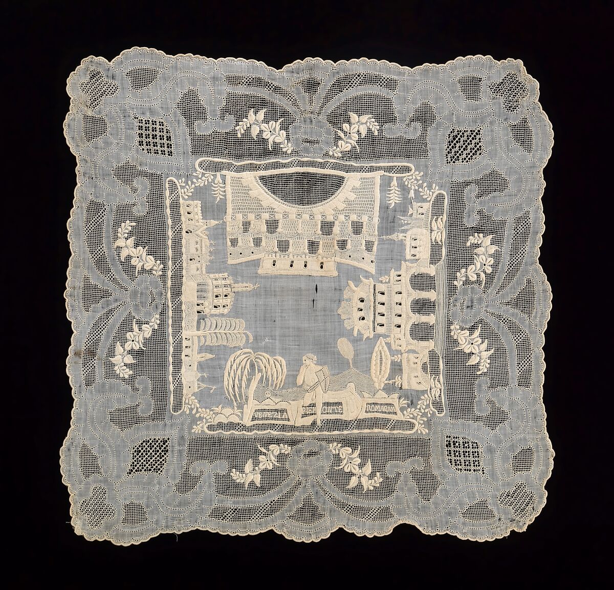 The inscription on this handkerchief reads: "Venezia Piemonte Romagna" (Venice, Piedmont, Rome) all popular destinations for 19th-century travelers. Handkerchiefs such as these were collected in the period as souvenirs of the one's European tour.