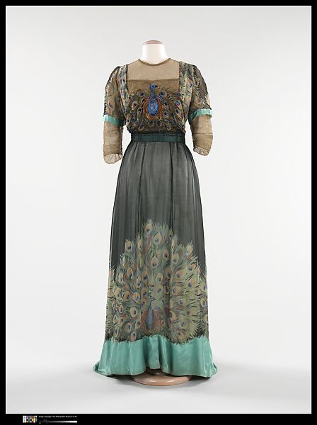 Associated with royalty and symbolizing beauty, immortality and exoticism, the peacock has long been a favorite motif of artists. Particularly during the Art Nouveau movement, designers incorporated the birds into their work, inspired by the creatures’ sinuous bodies and showy feathers. In this gown, by the little-known Parisian house of Weeks, both printed and embroidered peacock motifs enliven the skirt and bodice. The metallic threads of the embroidery add a shimmery quality to the bodice, while the blue and green colors of the birds are picked up in the sash, sleeve ends and hem band. In an additional couture touch, the printed textile has been cut and pieced to form the sleeves of the dress, giving the appearance that a different yet precisely matched fabric has been used. Worn by Mrs. Francis Neilson (née Helen Swift), daughter of the founder of Swift & Company, the dress was undoubtedly purchased during a trip abroad in 1910.