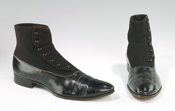 The button Balmoral had been worn as an ordinary day shoe prior to World War I, but in the post-war era, it became increasingly used for more formal occasions. In this classic example of a dressy men's shoe of its period, the patent vamp and cloth top add to the formal tone. The cloth top is a clear parallel to the spat, which was worn to dress up a plainer shoe. The pleasingly slender lines are typical of the years around 1920. With the increasing importance of low shoes and more casual styles, high button shoes came to be seen as stuffy and old-fashion and eventually fell out of use in the 1930s.