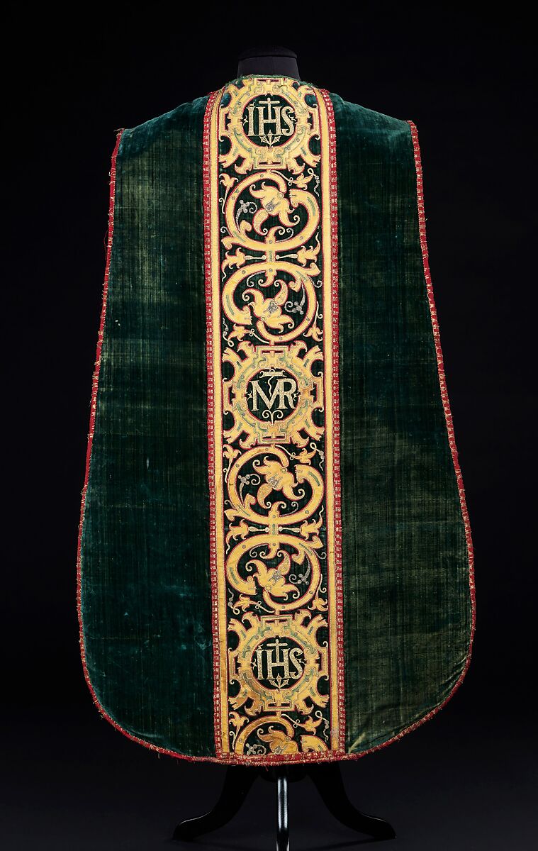 The Christian monograms IHS (Jesus Hominum Salvator- Jesus, Savior of Mankind) and MAR (possibly signifying Maria- the Virgin Mary) decorate cartouches on this Chasuble- tabard-like clothing intended to be worn by a Roman Catholic priest when officiating church services. Though from a distance the design is elegant, closer inspection reveals the central band to be ornamented with simple yellow satin silk appliqués, sewn onto the velvet ground. The shadows on the illusionistic strapwork are even executed in paint. The green velvet ground- though old- has been patched and repurposed at an unknown date from a different garment.