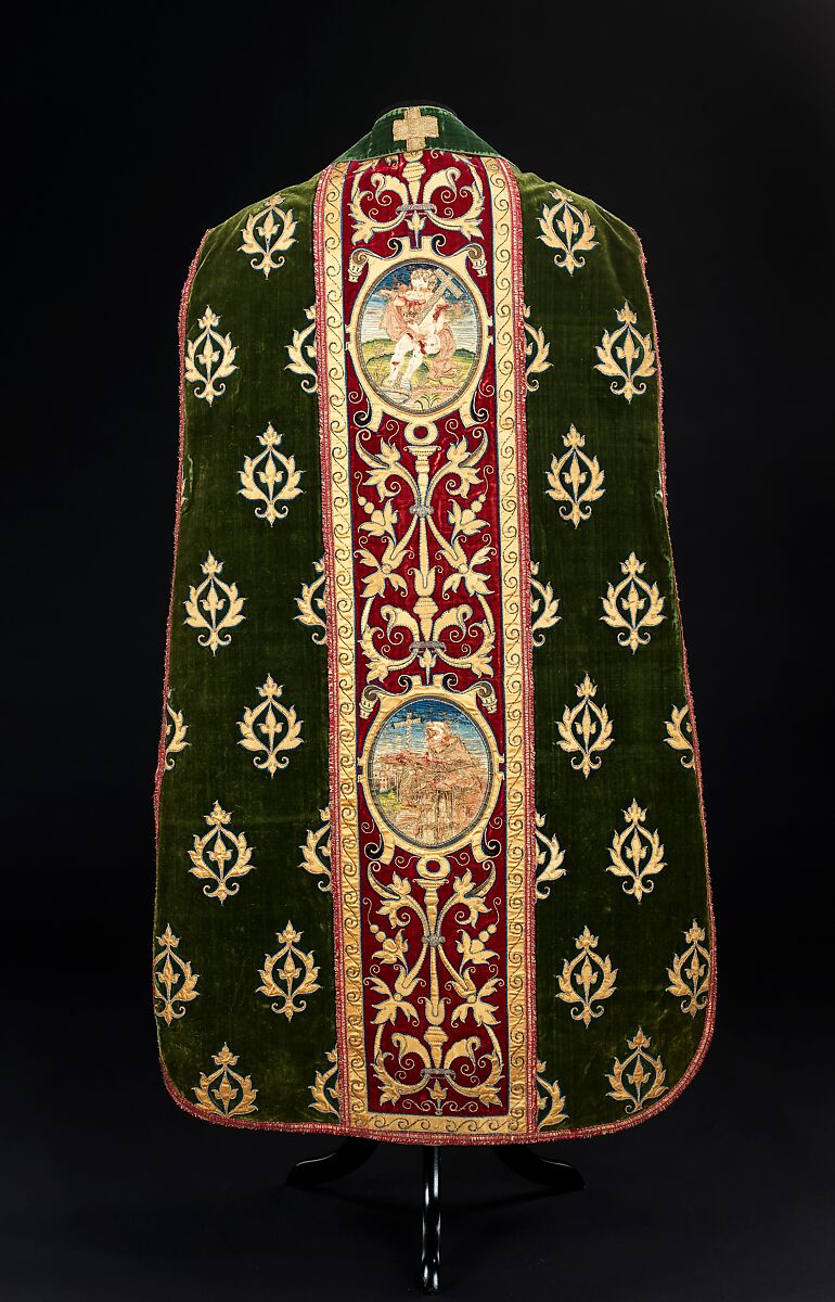 Three embroidered roundels, late 16th-century in design and of middling quality of execution, represent a female saint, perhaps Barbara, the Infant Christ, and Saint Francis. They have been sewn, along with yellow satin silk appliqués, onto two red velvet strips, themselves applied to later, green velvet, decorated with additional yellow satin silk appliqués, the whole creating the front and back panels of a chasuble- worn by the priest over his garments. They have been accessorized with a matching stole and maniple. Though the overall appearance of this ensemble reads elegantly from a distance, closer inspection reveals a thin velvet, loosely spaced (and therefore cheaper) or nué embroidery, and even painted in shadows on the cartouches.