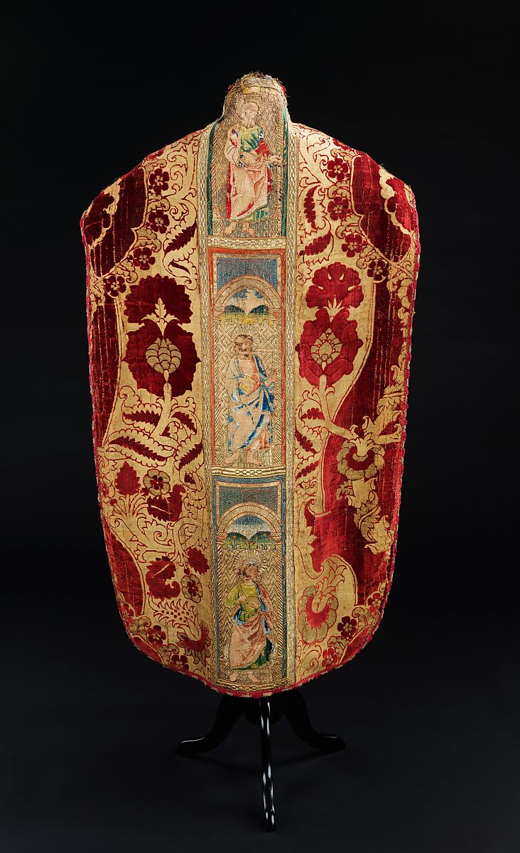 Two different red velvet cloths of gold have been cut, patched and collaged together here. Of good quality, but unusual in both technique and design, these can be attributed to Spanish weavers responding to- and subverting- more traditional Italian velvet conventions. In the late nineteenth, perhaps early twentieth century, these were paired with fragmentary embroidered orphreys depicting five of Christ's disciples, salvaged from some other piece, to create this chasuble-like garment. Too large to actually have been worn comfortably, this "vestment" was most likely assembled by a dealer to appeal to the art market than for use within an ecclesiastic context.