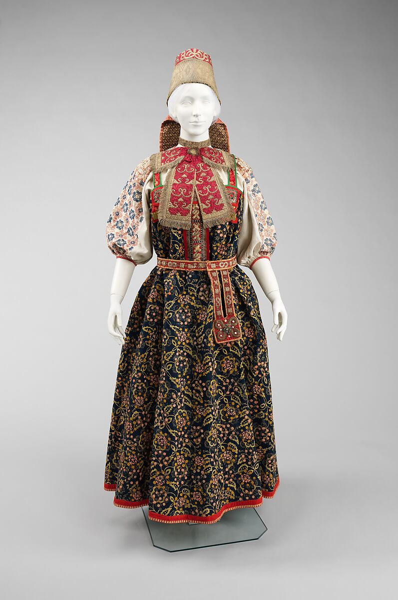 (a) Traditional Russian costume consists of straight, flowing lines. Beginning at the turn of the 18th century, the sarafan, a long, sleeveless dress, became the most popular article of peasant women's clothing in the Northern and Central regions of Russia. The style was worn over a blouse and often accompanied by a belt or apron. The bold printed pattern creates a rich appearance in combination with the traditional gilt metallic embroidery on red.