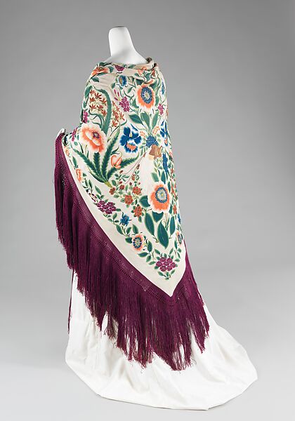 This foldover shawl is a tour de force of Chinese embroidery. The orientation of the needlework indicates that it was to be worn folded into a triangle; each side incorporates a different color palette. The monochromatic side uses variations in hue to define details. The polychrome side employs beautiful gradations in color, particularly in the configuration of the bird motif. It also features gilt thread, making it unique among other examples in the collection.