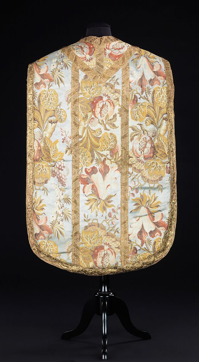 This is an appealing example of good quality priestly vestments produced in considerable numbers at the end of the nineteenth century. The silk was machine-woven, its bold, chintz-like pattern emulating earlier, eighteenth-century work, with mustard yellows and beige-browns cleverly used to evoke the pricey metallic thread effects of older textiles.