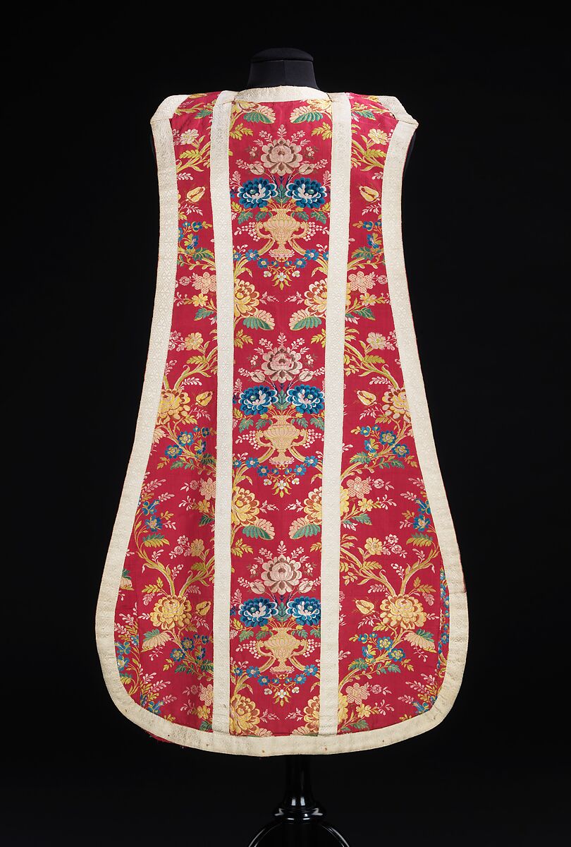 This tabard-like chasuble would have been worn by a Roman Catholic priest over his alb gown when officiating at church services. The boldly colored silk is an interesting example of cheaper production: to keep costs down, the silken threads of the brocaded elements, which define the figurative pattern of flowers and urns, were as thin as possible. As a result, many have been lost through abrasion, especially on the front of the chasuble.