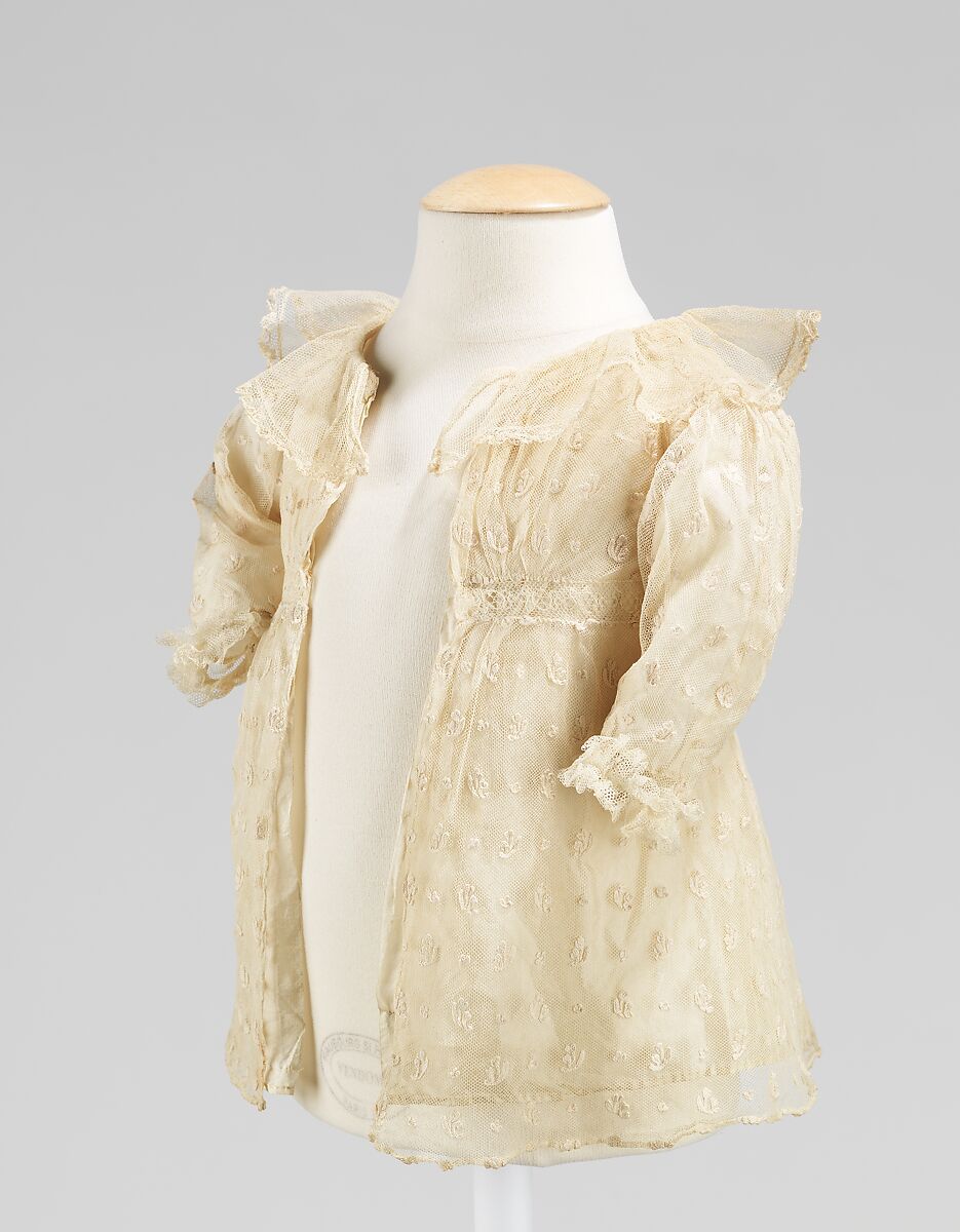 This high-styled infant's garment reflects the styles of the time. Every detail is in place, including the gathering of the interior lining which is visible through the net layer. Great attention was also taken to the detail at the sleeve cuffs. The sprig embroidery patterning worked on the net was typical of early nineteenth century garments.