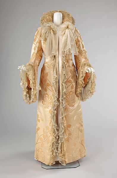 This dramatic coat is very indicative of the Art Nouveau style which was popular at the turn of the century. The sinuous curves of the textile and the symmetrical seaming make this exemplary of the House of Worth's design aesthetic which was well retained throughout its run.
