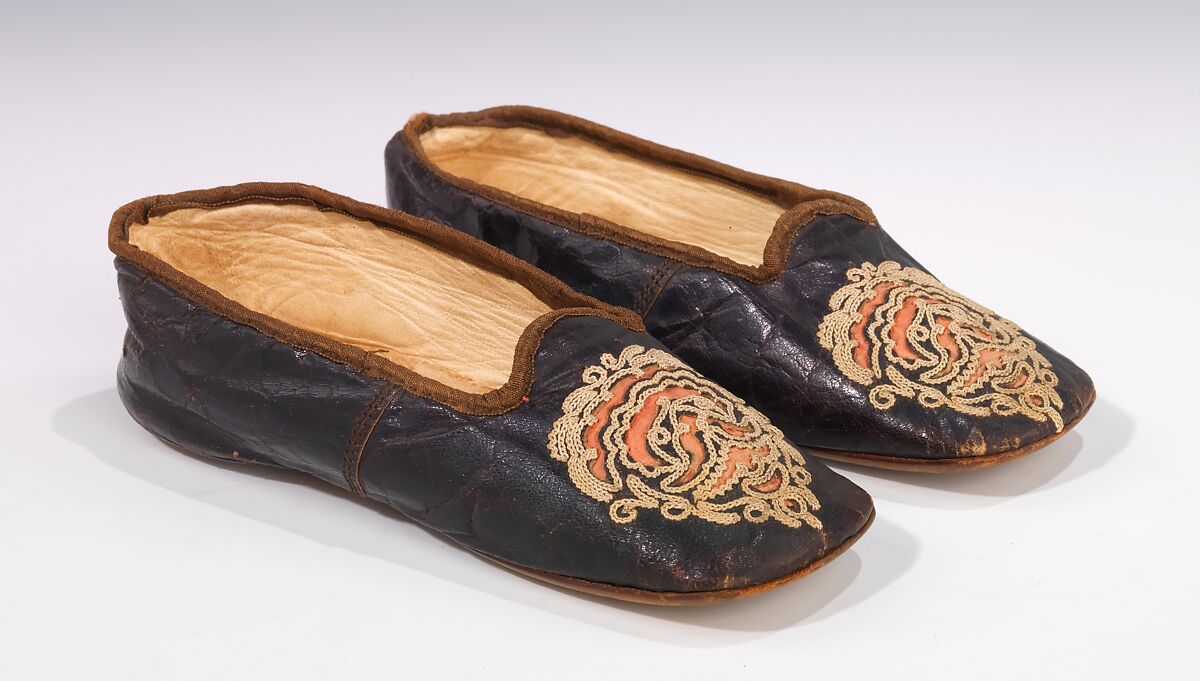 Worn by a girl of five years in age, these decorative slippers are a miniature version of an extremely popular women's style of the 1850s and 1860s. Bronze kid slippers with an elaborate chain-stitched cutout medallion on the vamp backed in colored silk were sometimes known as "chameleon shoes", as on some models the silk backing was removable, and could be interchanged with another color to complement the wearer's dress. Despite the elaborate appearance, this type of shoe was worn for morning dress, not for formal occasions.