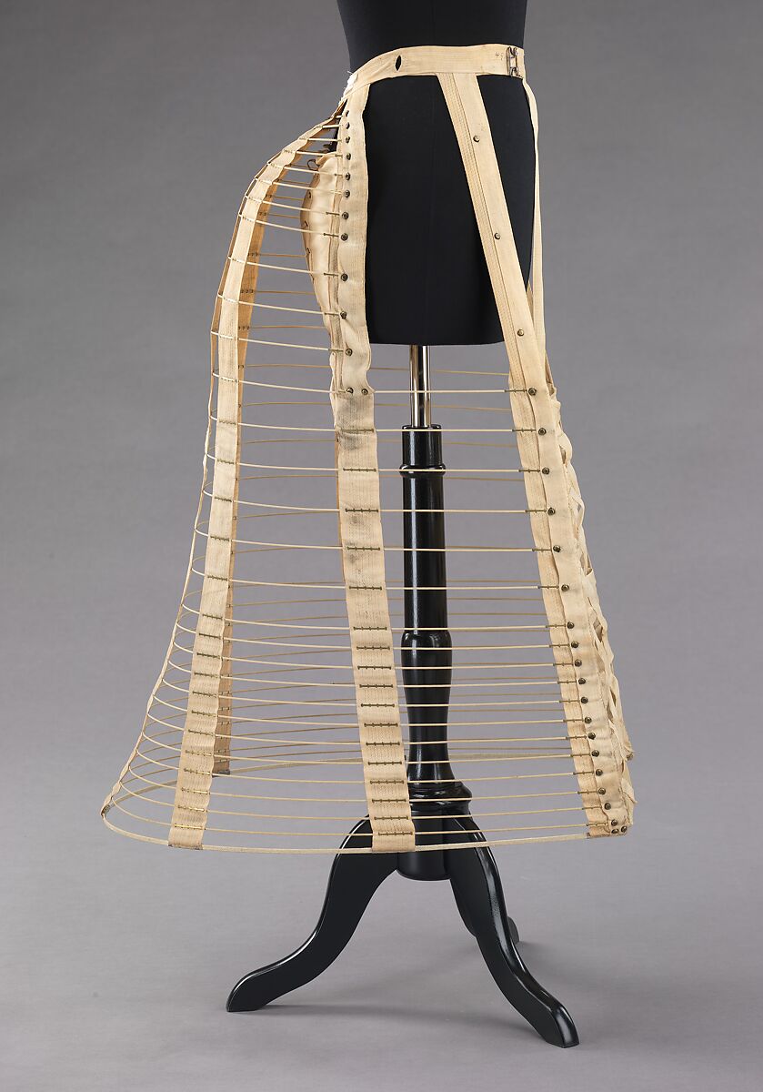 During the revival of the bustle, from 1883 to the end of the decade, women wore skirt supports to mold their dresses into the desired shape of the period - small, waisted, flat at front with the skirts swept over a pronounced bustle at the back. The bustle was so large it sometimes sat at a right angle from the wearer's body. This example of a bustle would be worn over the chemise, corset and drawers, with an additional petticoat worn on top to lessen the chances that the hoops might show through the dress fabric. It is interesting to see the sculptural undergarments required to accomplish the shape of the extreme bustle of the 1880s.