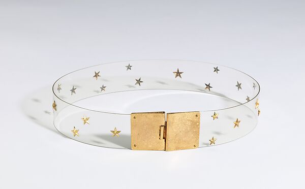 Schiaparelli often used her accessories as avenues of expression for her Surrealist ideals. Buckles, clasps, decorations and belts themselves were made of unusual materials, such as plastic and plaster, and in quirky shapes that could elicit a viewer’s double-take. To pair such an off-beat accessory with a couture garment was just the kind of humorous irony Schiaparelli enjoyed incorporating into her work. Here, she uses a bubbled plastic studded with gilded stars. The celestial realm and astronomy were favorite themes of hers, and was present in many collections. There is another example in the Brooklyn Museum collection, also owned by the fashionable Millicent Rogers, in a different color (see 2009.300.2764).