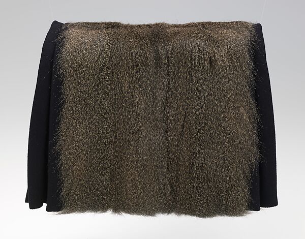 Monkey fur from the genus Colobus was highly desired for clothing, particularly during the early 20th century, because of its sleek black color and length. This muff by Schiaparelli is monkey fur of a different type, most likely from the squirrel monkey, whose fur is speckled and looks olive green because of the blending of brown and white. Schiaparelli worked to incorporate unusual fabrics that expressed her unconventional design sensibility. This specialized type of fur together with the deep navy broadcloth is a chic, novel example of that idiosyncrasy.