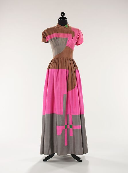 Adrian developed a signature style in the mid 1940s that echoed the Cubist paintings of artists like George Braque (1882-1963) and Pablo Picasso (1881-1973). A painter himself, Adrian manipulated pieces of fabric as deftly as his paintbrush in designing dresses like this, juxtaposing bright colors and bold shapes. Here his use of bright pink and emerald green accentuates the skillful piecework. Adrian's wife, the actress Janet Gaynor (1906-1984), included this dress in her wardrobe for the couple's African safari in 1949 and later donated it to the Brooklyn Museum.