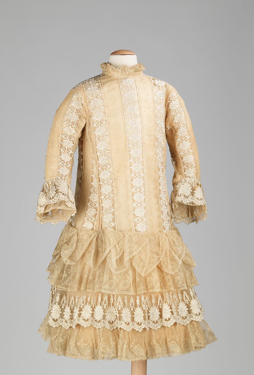 This is an example of a very typical girl's party dress for the period. Alternating stripes of sheer material was a prominent configuration at the time for both women's and girl's dresses. It is obvious that this dress was made with a great deal of detail and thought, which can be seen in the double ruffles of the underdress sleeves as well as the overdress sleeves, and the multiple ruffles of the skirt and the underskirt. The low bustle effect in back is appropriate for a young girl, and the long-waisted silhouette was typical of the time. The interior ties of the skirt create more of a bustle effect.