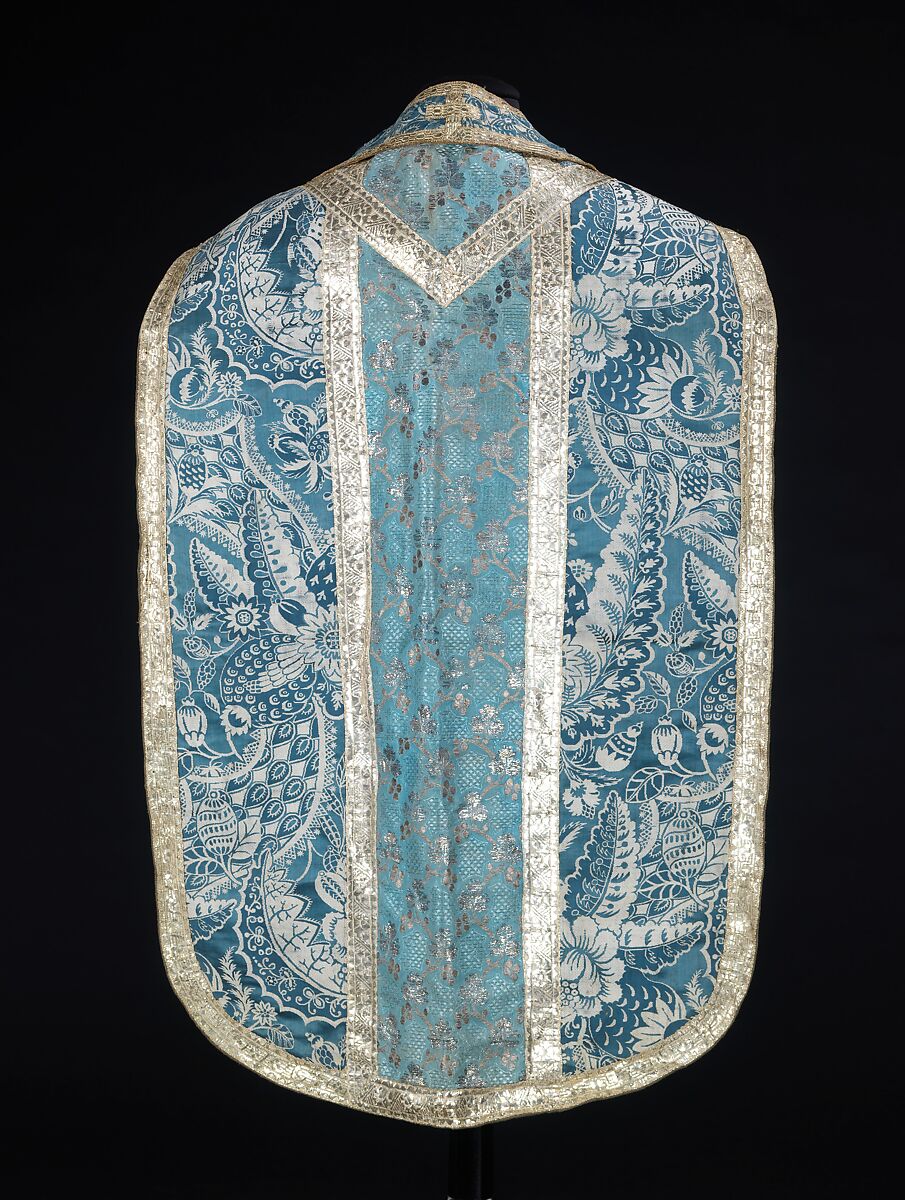 Although the shape of the garment in this vestment set implies that it was assembled at the turn of the eighteenth and nineteenth centuries, the two types of silk from which it is made were both produced considerably earlier and have been repurposed here. The central strip on both front and reverse of the tabard-like chasuble is a fine example of so-called "bizarre silk", datable to around 1700-1720, decorated with delicate, silver-coated lancé strips. The boldly-patterned, deeper blue silk damask flanking this was perhaps reused wall hanging, woven around 1730-40. It has been carefully patched to create the current shapes, explaining why the pattern is not symmetrical as would be more conventional for this period had a bolt of brand-new damask been used. This is an interesting example, therefore, of treasured textiles repurposed.